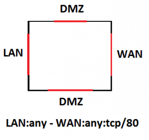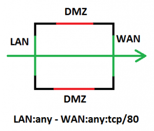 To try to illustrate the differences, consider a router with 4 interfaces and we want to allow traffic from the LAN to the WAN on tcp/80 for web traffic to the Internet.